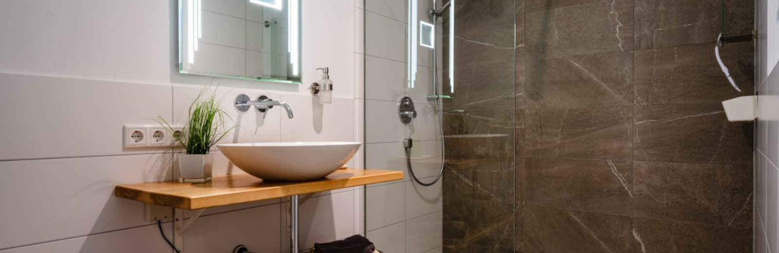 Im Badezimmer finden Sie ein WC, ein Aufsatzwaschbecken, eine Dusche mit Decken-Regenbrause, einen beleuchteten Spiegel mit integriertem Kosmetikspiegel, einen Fön und Nachtbeleuchtung (Glasschiebetür zum Zimmer).