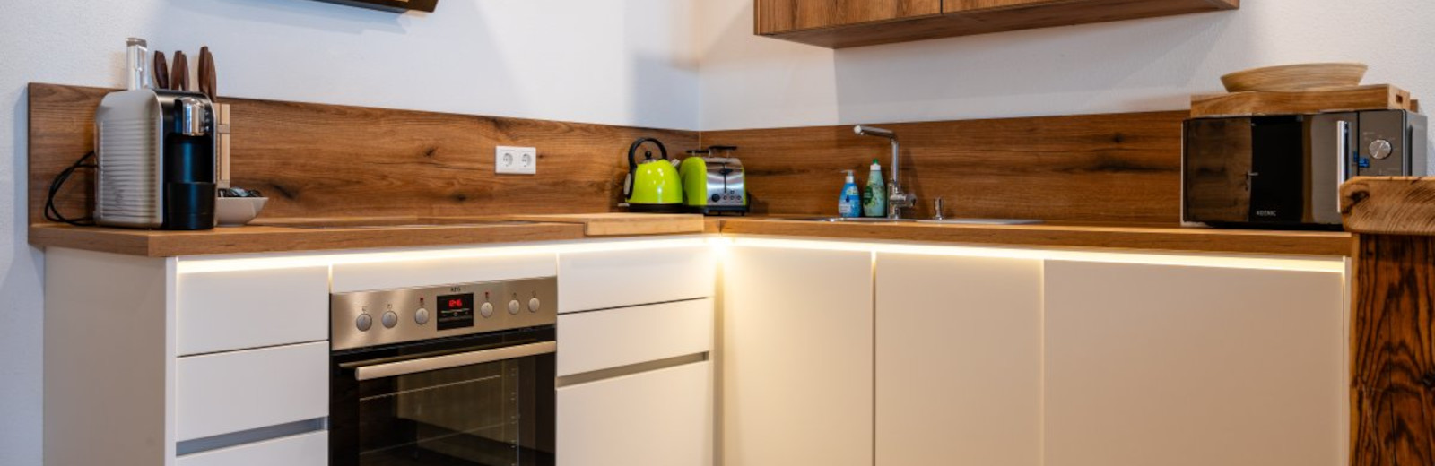 Für ein gemütliches Essen ist die Küche mit allem ausgestattet was das Herz begehrt. 4-Platten-Induktionskochfeld, Backofen, Mikrowelle, Kühlschrank mit Gefrierbereich, Spülmaschine, Toaster, Wasserkocher, Geschirr und Besteck, Kaffeekapsel-Maschine (Kapseln zum Selbstkostenpreis im Haus erhältlich.